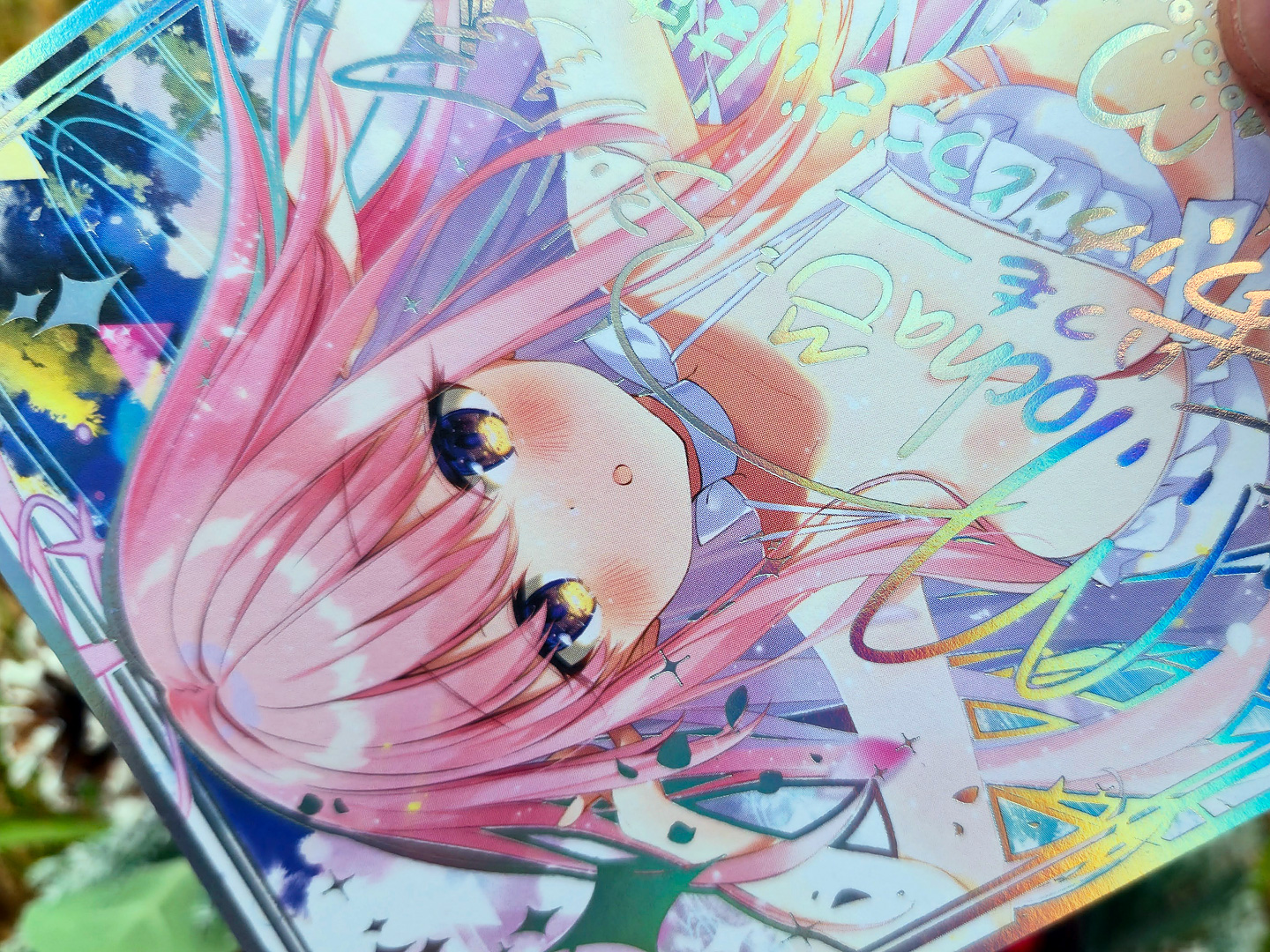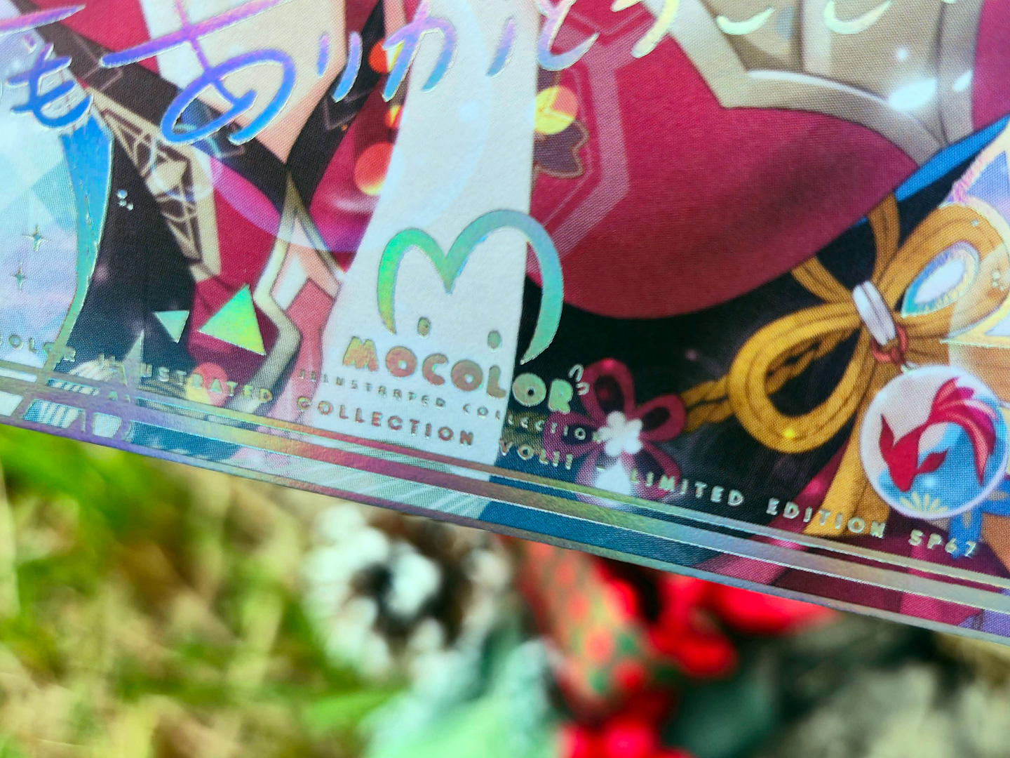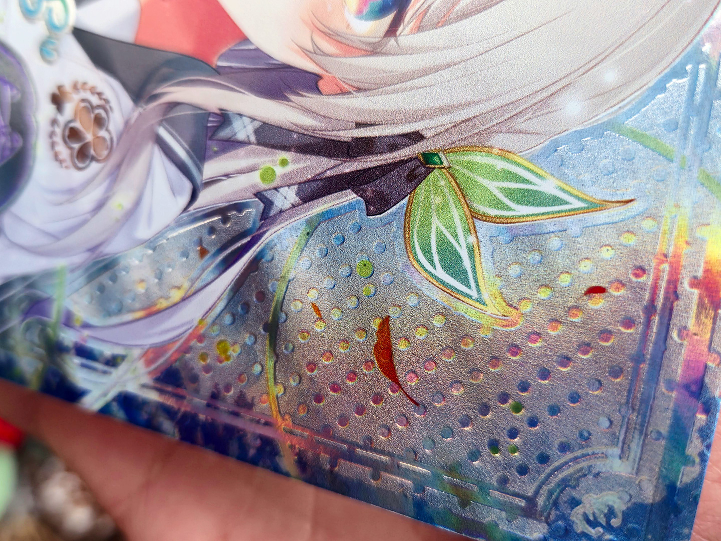 這次MO11的特典卡依然是用上幻彩鐳射UV工藝,正常角度看過去,反光效果會比一般燙金更亮、更搶眼一點~!!配合圖面輕輕轉動視角時,會跑出那種細碎的光澤變化,看起來超有層次感的(心) 這次尤其智乃及流螢的UR還特別加強了局部凹凸燙壓,希望不只是「遠看很閃」,而是靠近、摸一摸的時候,也能感受到那種溫和但很明顯的手感差異啊~不過照片未必拍得很好,所以還是最推薦大家到活動現場親眼、親手感受一下實物的魅力喔!~