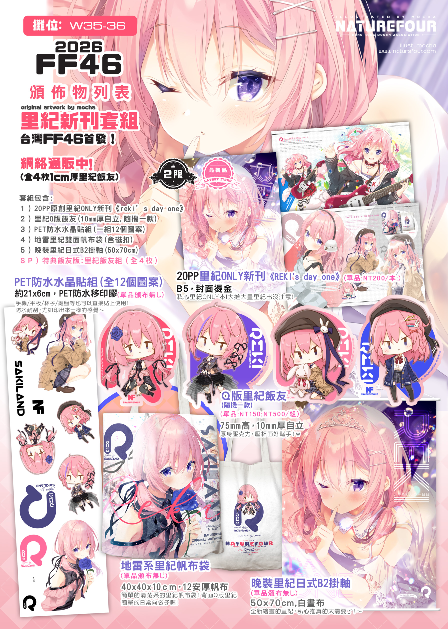 登登登!! 這次準備的是久違的原創新刊,而且還是里紀ONLY的耶!! 因為我私心很大就是想單推里紀,所以就逼里紀出來囉XDD 全新繪畫的封面里紀有一併做成掛軸包含在套組裡面,滿滿里紀的本子及地雷系里紀帆布袋之餘,還有小里紀飯友及PET水晶貼,在手機在桌面上使用也非常方便喔!