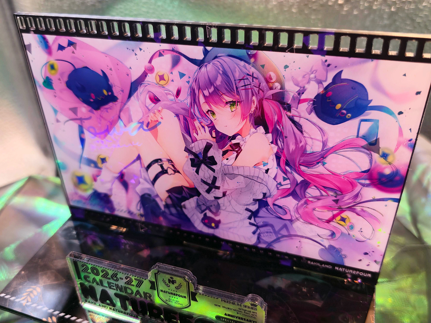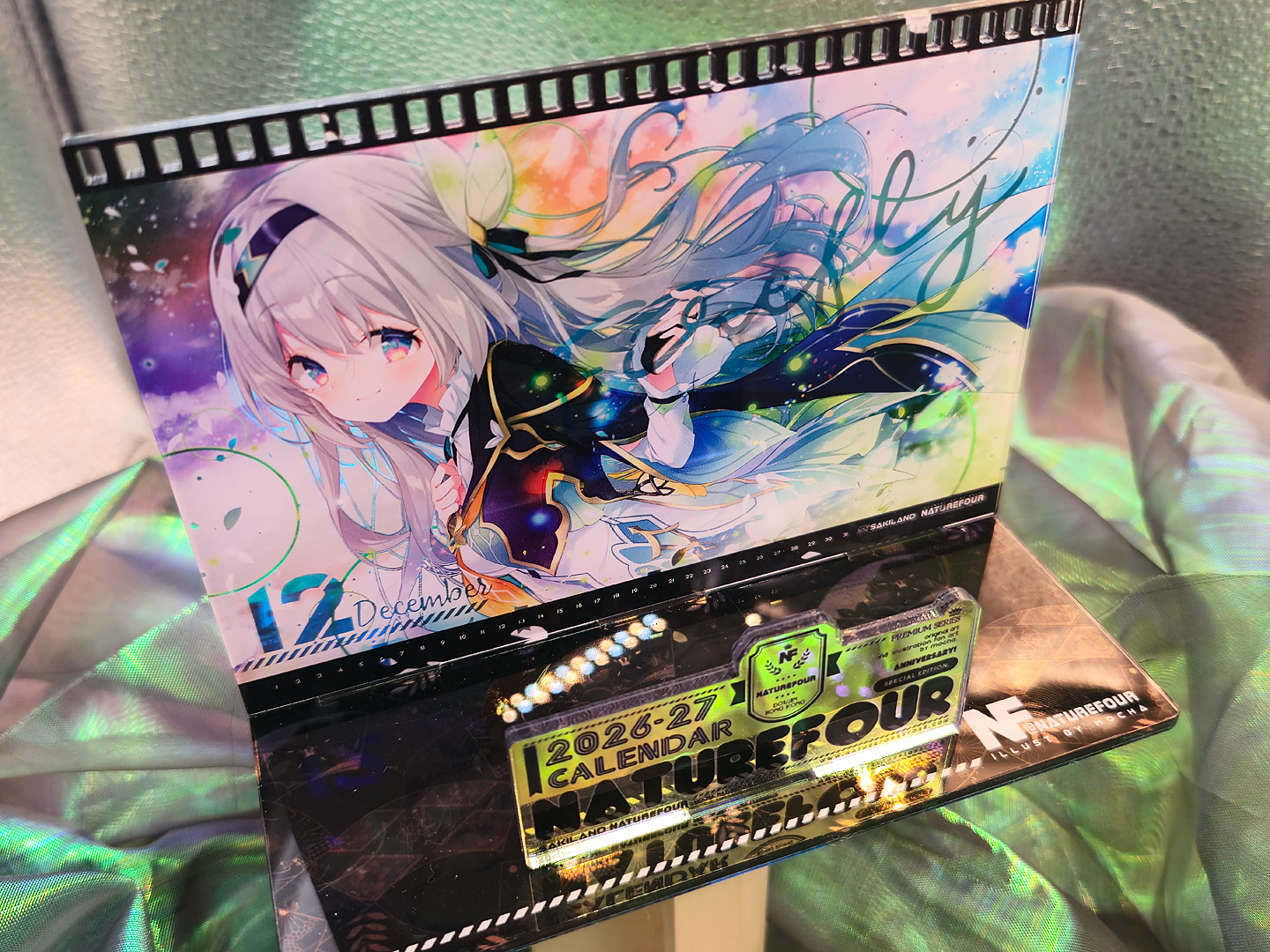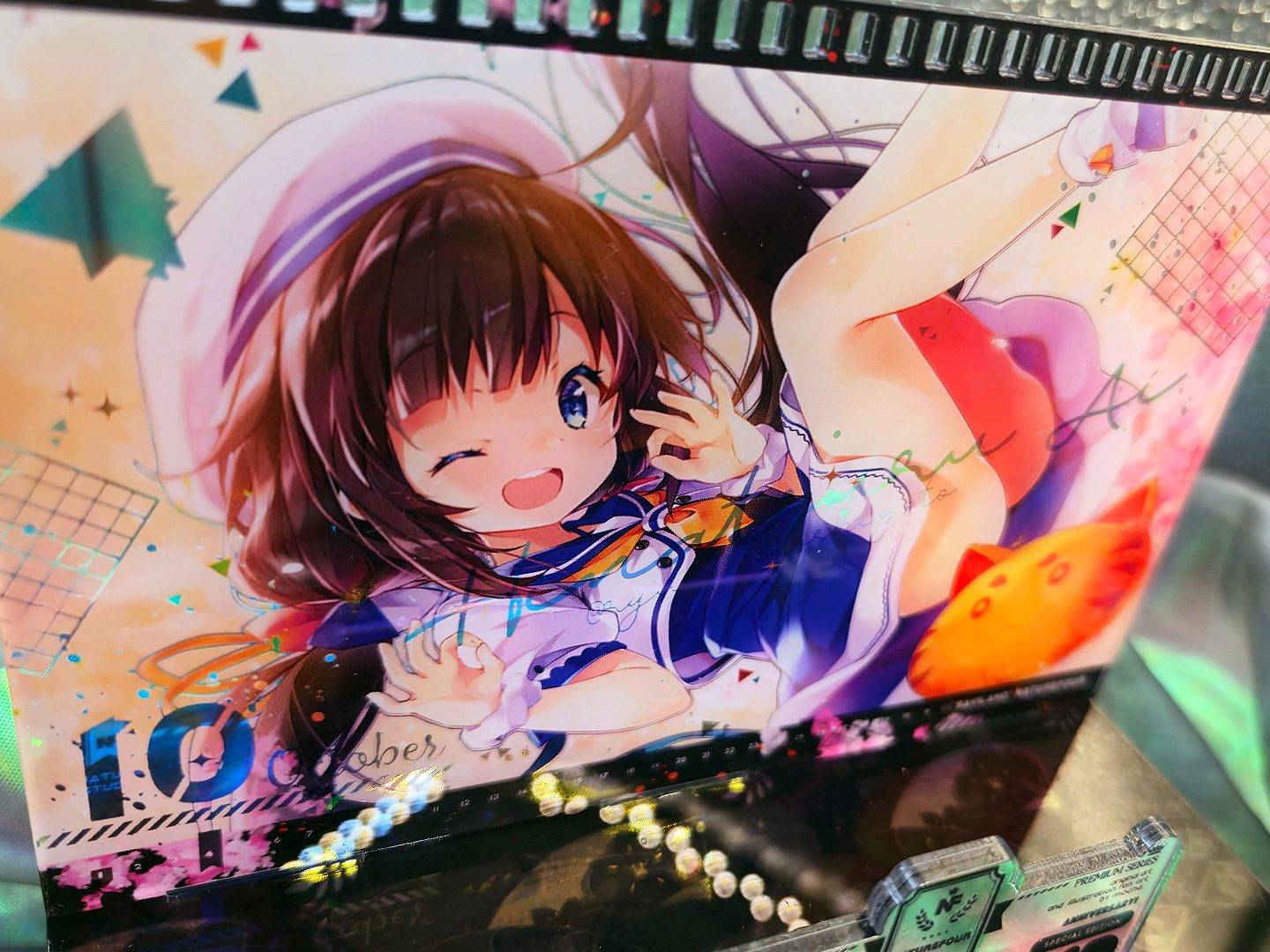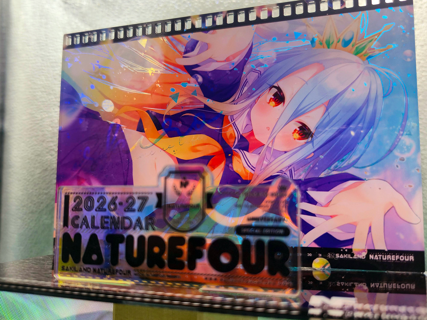 A3燙金月曆套組中的特典:小型壓克力月曆款小立牌!~這次也有做了幻彩的效果,而幻彩的部份,就剛好是燙金的部份,所以在壓克上看回圖片,透過光線又可以折視另一個不同的效果出來喔~