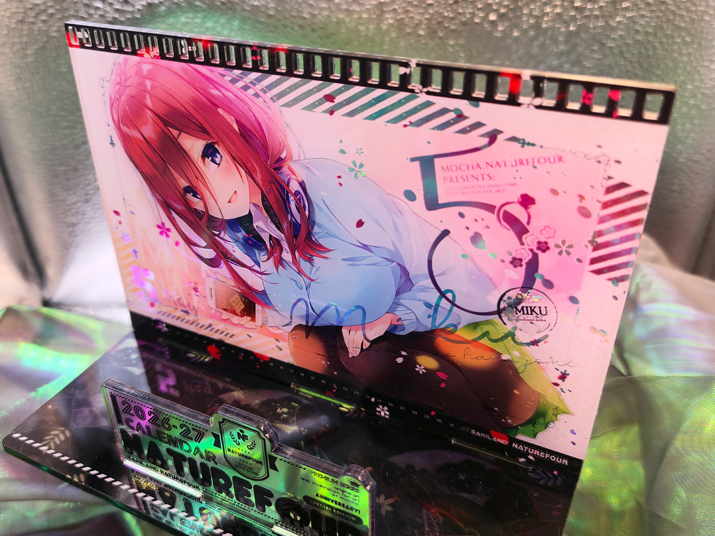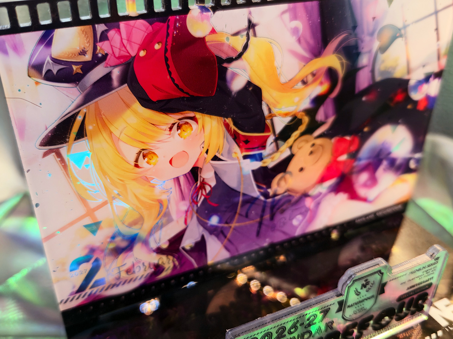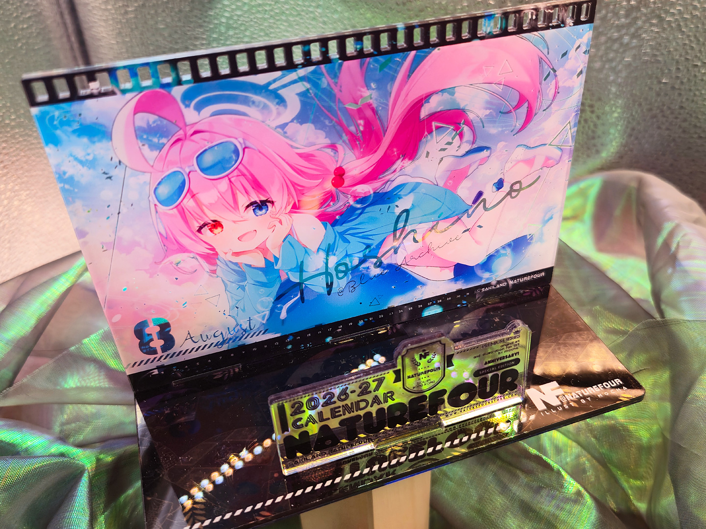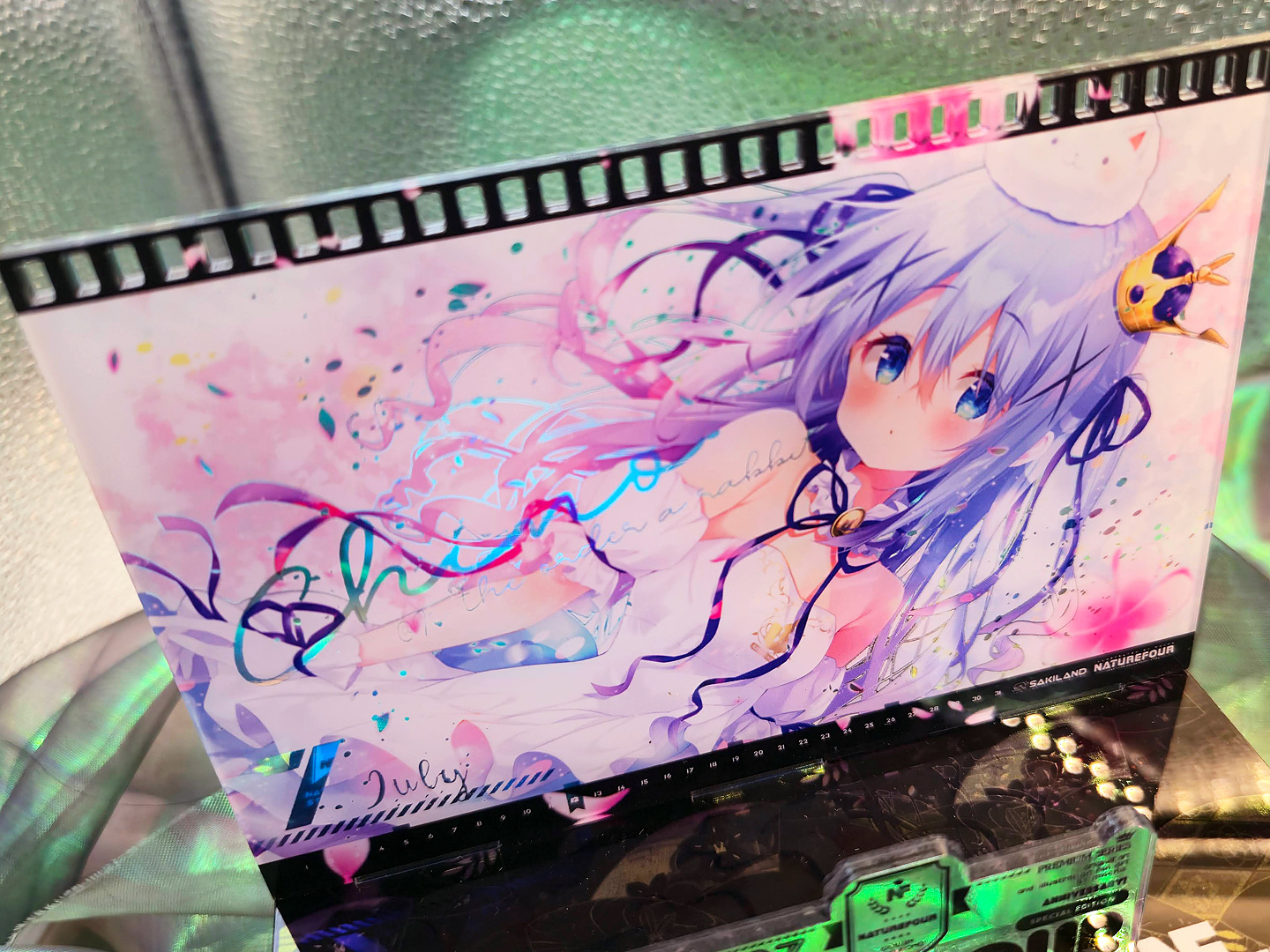 A3燙金月曆套組中的特典:小型壓克力月曆款小立牌!~這次也有做了幻彩的效果,而幻彩的部份,就剛好是燙金的部份,所以在壓克上看回圖片,透過光線又可以折視另一個不同的效果出來喔~