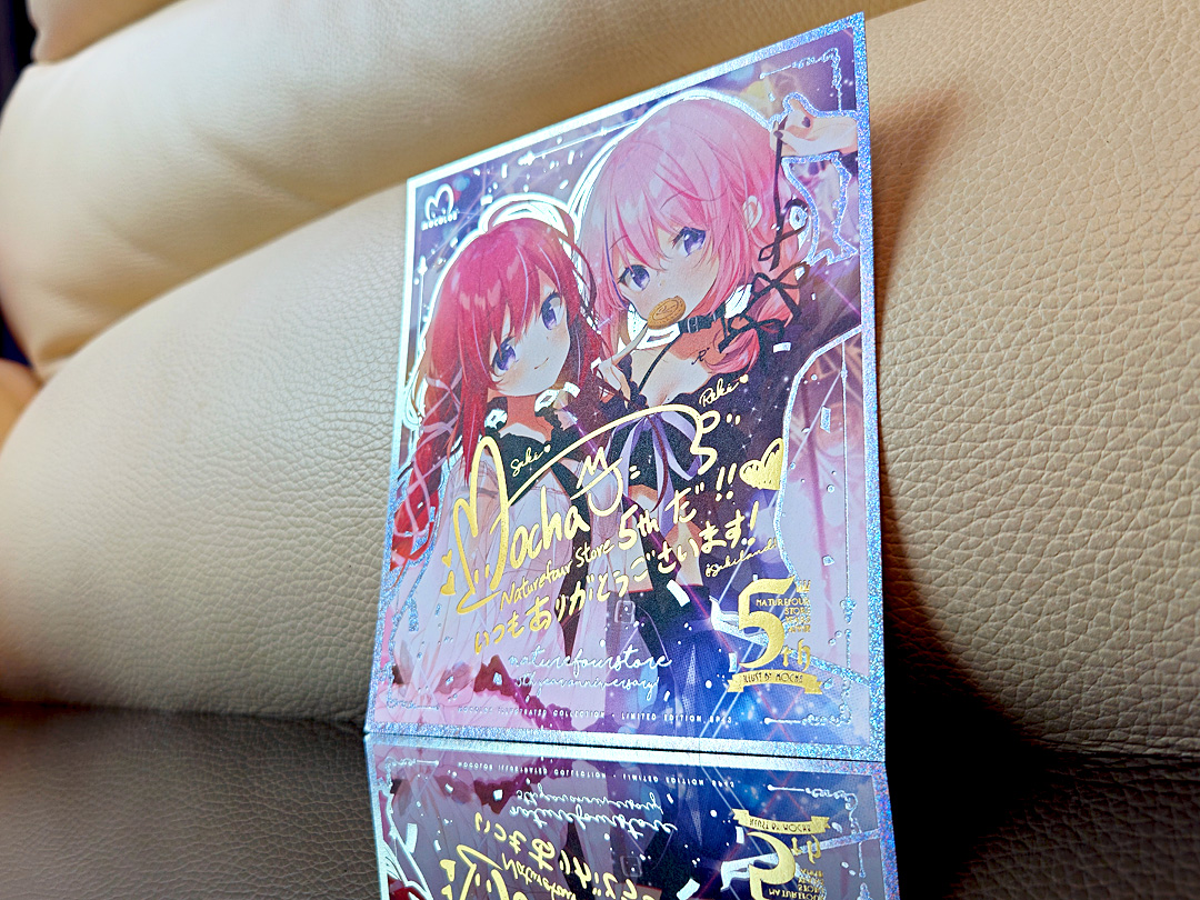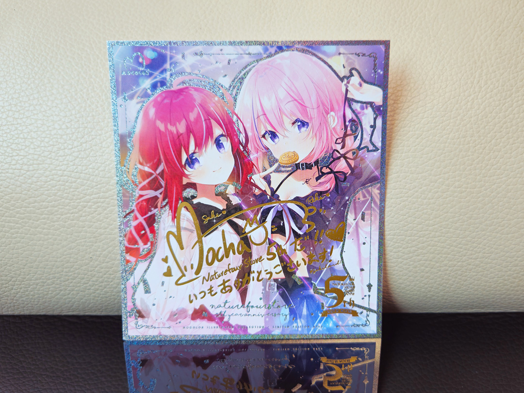 這次的紗紀里紀也是mocha重新繪畫,也一拼繪畫新的服裝哦!!所以除了繪製了金屬徽章之餘,也一拼製作了這次五週年通販紀念的雙燙金色紙特典卡來作為小禮品,免費配佈給大家喔!!